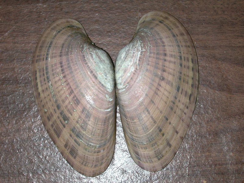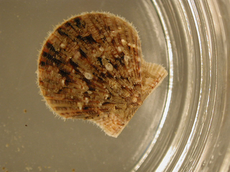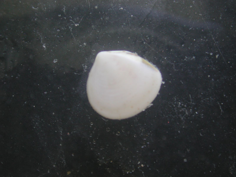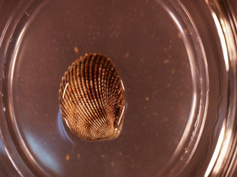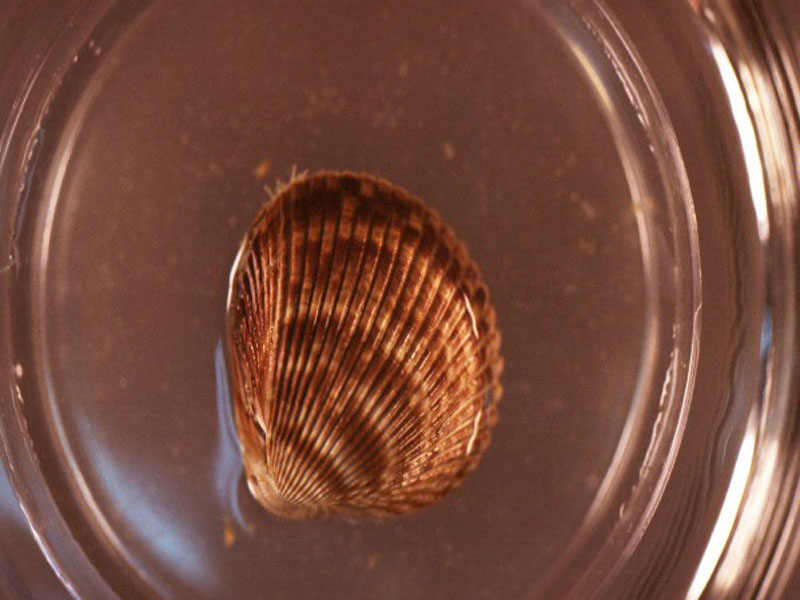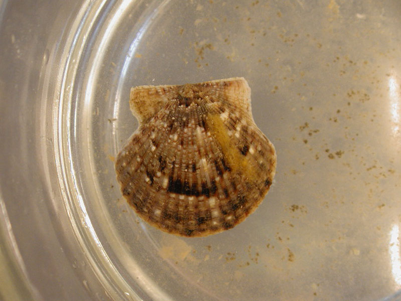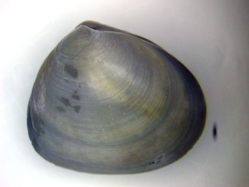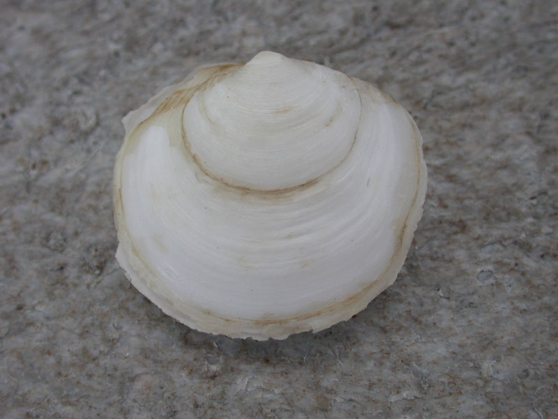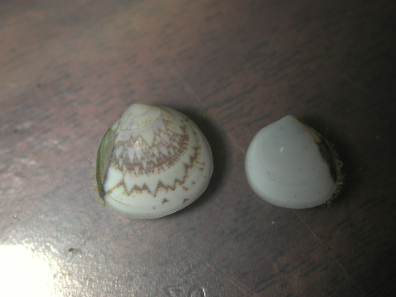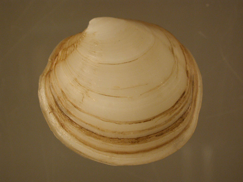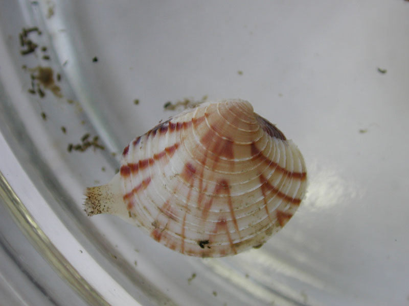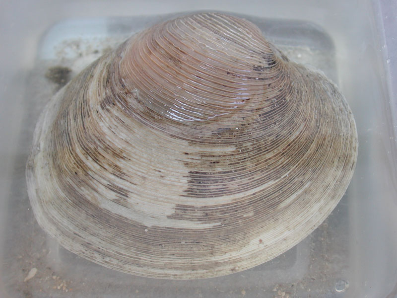 The hard clam occurs often in sand or mud, between high- and low-tide lines in shallow coastal waters. This clam is cosmopolitan in distribution, ranging from the Gulf of St. Lawrence in Canada to Florida and Texas, and supports important fisheries and aquaculture industries within its range. The broadly oval, moderately inflated clam has a thick-shelled, solid appearance with equal valves, or shells, and a heart-shaped appearance when viewed with the hinge up. The color is a dull grayish yellow, but can be brownish or black when freshly pulled from the bottom. A subspecies, know as notata, is characterized by reddish or chestnut-colored, chevron-shaped markings on the shell exterior. Many aquacultured clams feature these striated markings. The surface of the shells has many closely-set, erect concentric rings; stronger near the umbo (oldest part of the shell near the hinge) and smoother in the center. Internally the shell is white, sometimes with deep purple at the siphon end. The hard clam can reach up to 5 inches long and over 3 inches in width. The accepted common name is the northern quahog, but it is locally known as hard clam. The name "quahog" (pronounced co-hog) is derived from two Native American words meaning "closed" and "shell." Indians used the purple shell lining to make wampum beads, which were a trading currency in the colonial period. The genus and species names mercenaria (meaning "money" in Latin) refer to their former value. In addition to the regional names for this mollusk, there are different names for hard clams of different sizes. Littlenecks, a reference to the size of the siphons or “necks,” are the most valued aquaculture product size (approximately 1” across the hinge, or width).