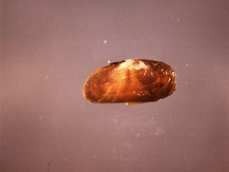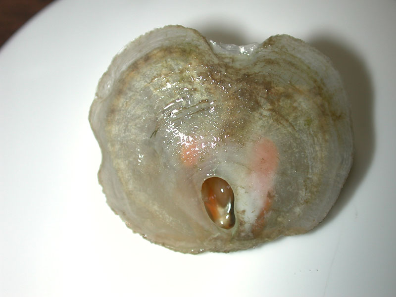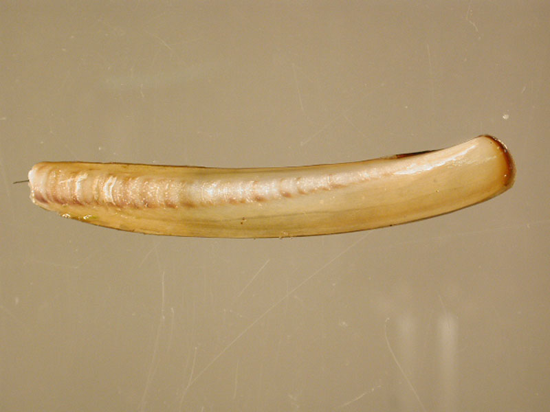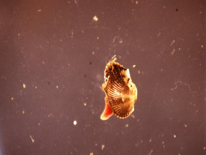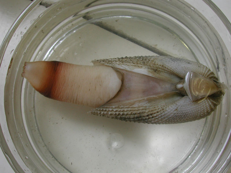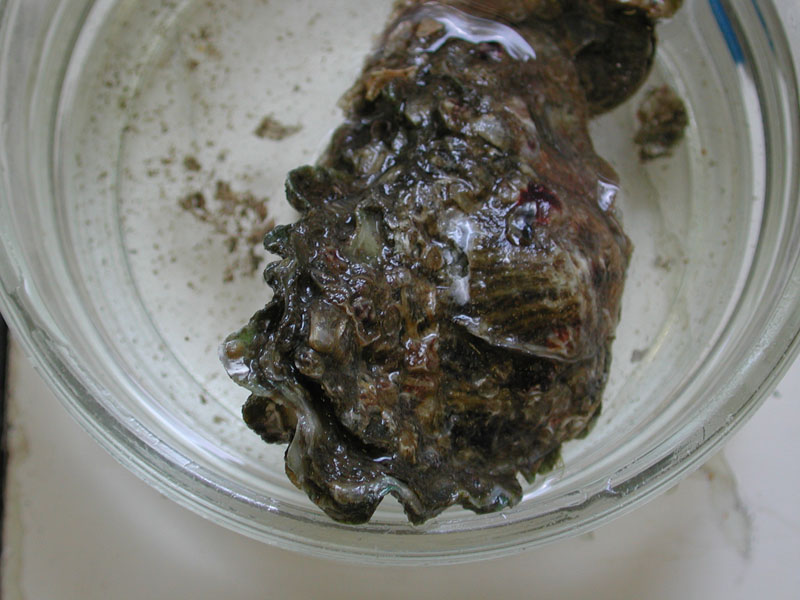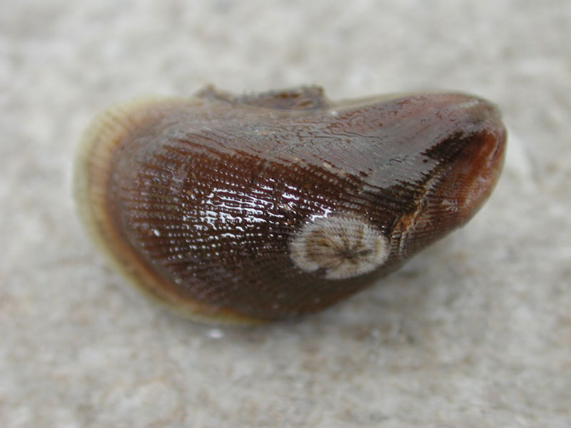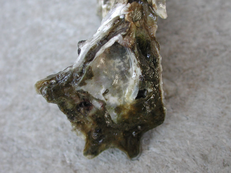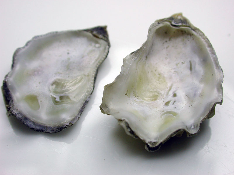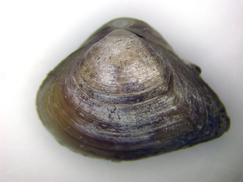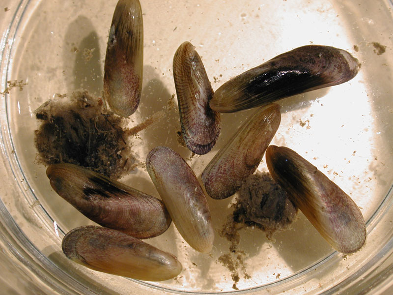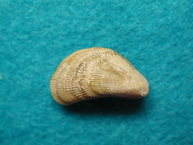 The hard clam occurs often in sand or mud, between high- and low-tide lines in shallow coastal waters. This clam is cosmopolitan in distribution, ranging from the Gulf of St. Lawrence in Canada to Florida and Texas, and supports important fisheries and aquaculture industries within its range. The broadly oval, moderately inflated clam has a thick-shelled, solid appearance with equal valves, or shells, and a heart-shaped appearance when viewed with the hinge up. The color is a dull grayish yellow, but can be brownish or black when freshly pulled from the bottom. A subspecies, know as notata, is characterized by reddish or chestnut-colored, chevron-shaped markings on the shell exterior. Many aquacultured clams feature these striated markings. The surface of the shells has many closely-set, erect concentric rings; stronger near the umbo (oldest part of the shell near the hinge) and smoother in the center. Internally the shell is white, sometimes with deep purple at the siphon end. The hard clam can reach up to 5 inches long and over 3 inches in width. The accepted common name is the northern quahog, but it is locally known as hard clam. The name "quahog" (pronounced co-hog) is derived from two Native American words meaning "closed" and "shell." Indians used the purple shell lining to make wampum beads, which were a trading currency in the colonial period. The genus and species names mercenaria (meaning "money" in Latin) refer to their former value. In addition to the regional names for this mollusk, there are different names for hard clams of different sizes. Littlenecks, a reference to the size of the siphons or “necks,” are the most valued aquaculture product size (approximately 1” across the hinge, or width).