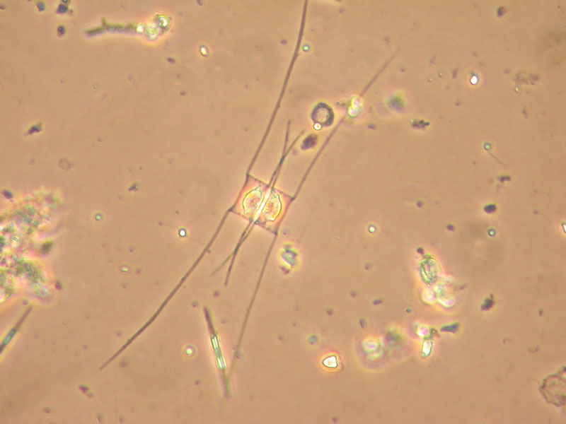 | 011 | Diatoms (Bacillariophyta) | Chaetoceros spp. | Click to View | cylindrical cells (appear rectangular); 4-84 µm wide; single or chains, spines (setae) at corners | Indian River and Suwannee Sound | Sebastian | DE;GJ;PI;HB;PR;SR | 44 | 34 | Good; Bad | acceptable food item for clams | Some species have long silica spines that can damage bivalve gills. | resting spores common; major bloom-former; blooms can occur any time of year, but most common in fall and spring |