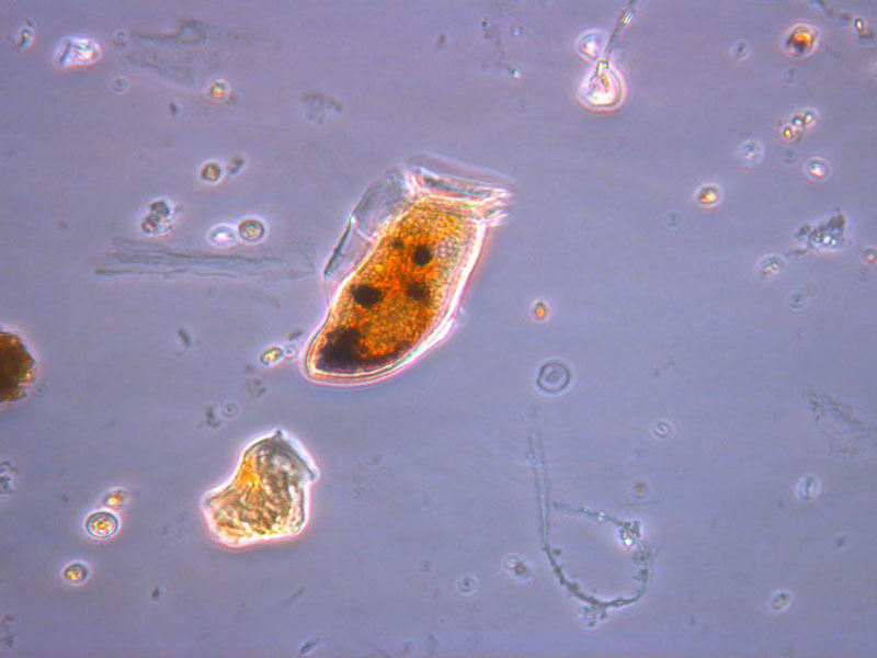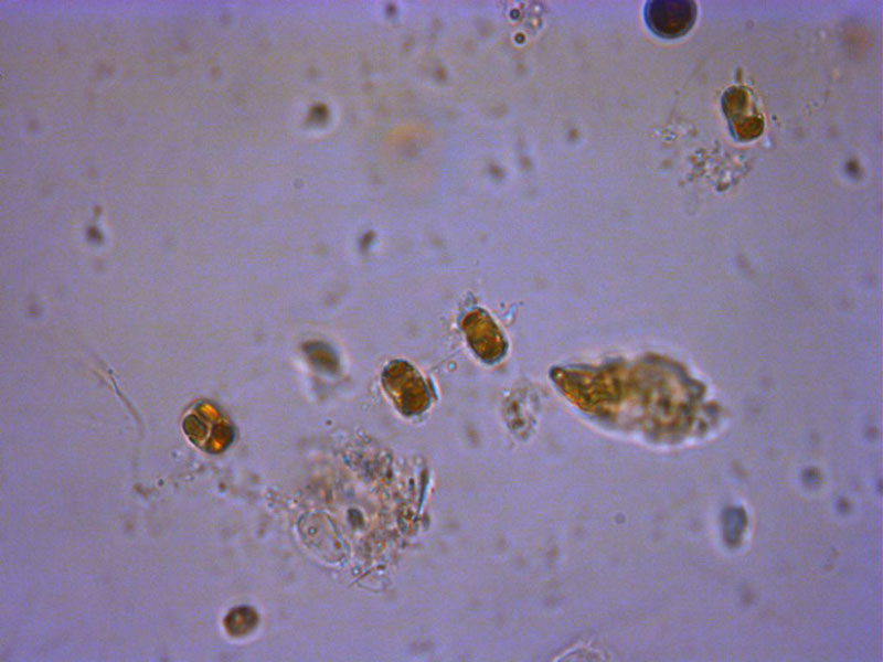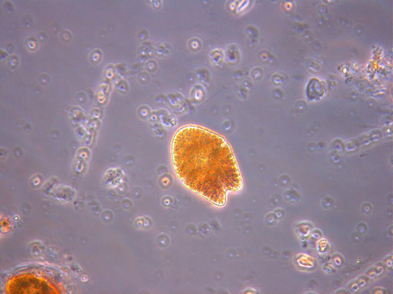 | 023 | Dinoflagellates (Dinophyta) | Akashiwo sanguinea | Click to View | has many different forms, one rounded end and one end with two lobes; 40-80 µm long; central nucleus; one transverse flagellum and one longitudinal flagellum | Indian River | Sebastian | 0 | 23 | Good | acceptable food item for clams | major bloom-former; blooms can occur any time of year, but most common in warm months; extreme bloom events can be associated with reduced oxygen levels in the water column | ||