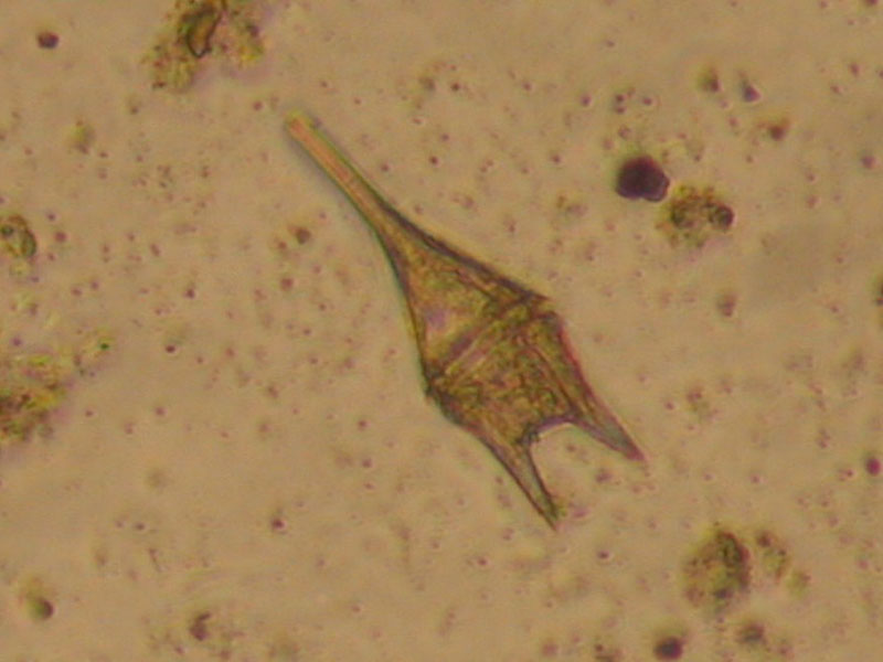 | 025 | Dinoflagellates (Dinophyta) | Ceratium hircus | Click to View | pentagonal cells with three long horns, one on top portion and two on bottom; 35-70 µm long, 30-45 µm wide at girdle | Indian River and Suwannee Sound | Sebastian | DE;GJ;PI;HB;PR | 53 | 59 | Good | acceptable food item for clams | Extreme bloom events can be associated with reduced oxygen levels in the water column. | |